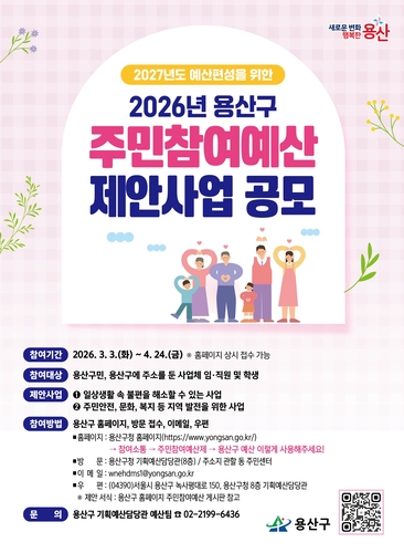 서울 용산구(구청장 박희영)가 4월 24일까지 2027년 예산에 반영할 주민참여예산 사업을 공모한다. 생활안전, 문화, 복지 등 주민 생활과 밀접한 분야를 대상으로, 총규모는 10억 원이다.