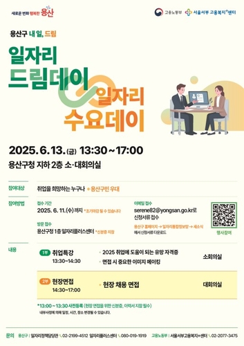 서울 용산구(구청장 박희영)가 오는 13일 오후 1시 30분 용산구청(녹사평대로 150) 지하2층 소·대회의실에서 '용산구 일자리 드림데이∞일자리 수요데이'를 개최한다.
