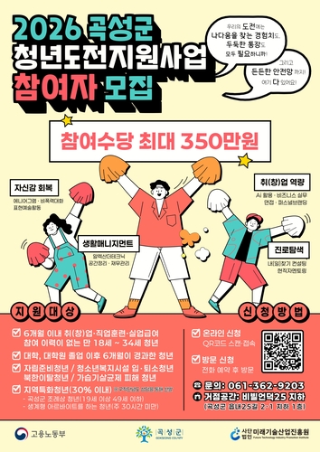 전남 곡성군이 구직 과정에서 지친 청년들의 자신감 회복과 사회 진입을 돕기 위한 '2026년 청년도전지원사업'을 본격 추진하고, 참여자를 모집한다고 26일 밝혔다.